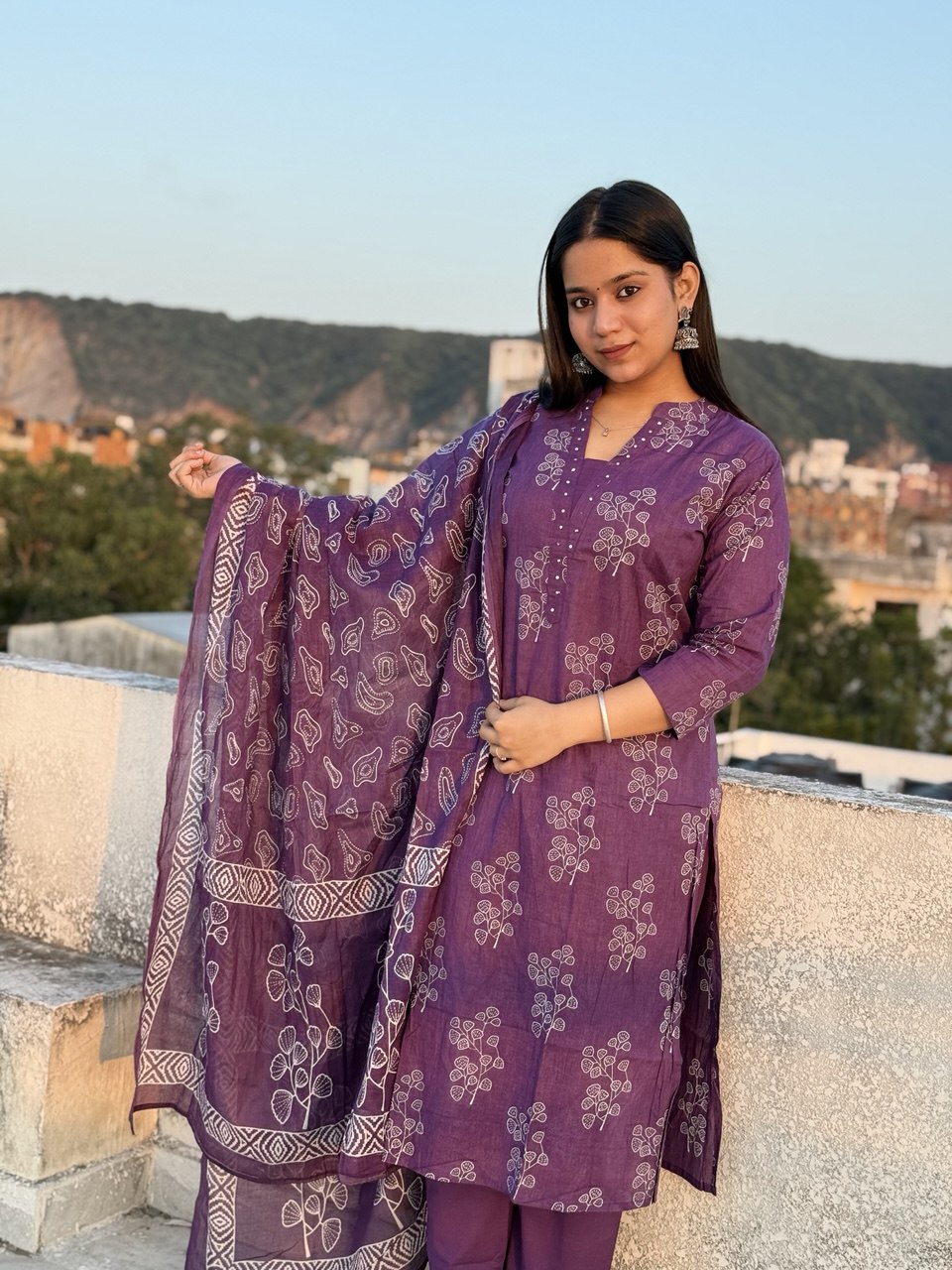 Discover timeless elegance with this exquisite purple floral printed 3-piece kurta set. The ensemble showcases delicate floral motifs rendered in captivating purple hues, presenting a refined aesthetic perfect for cultural celebrations and special occasions. This comprehensive set comprises a gracefully tailored kurta, matching bottom wear, and an accompanying dupatta, delivering a coordinated, sophisticated appearance. Designed with meticulous attention to detail, the set balances traditional craftsmanship with modern sensibilities, ensuring you make a distinguished impression whether attending weddings, festivals, or formal gatherings.