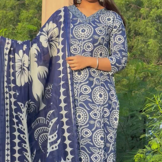 Royal blue A-line printed 3piece kurta set